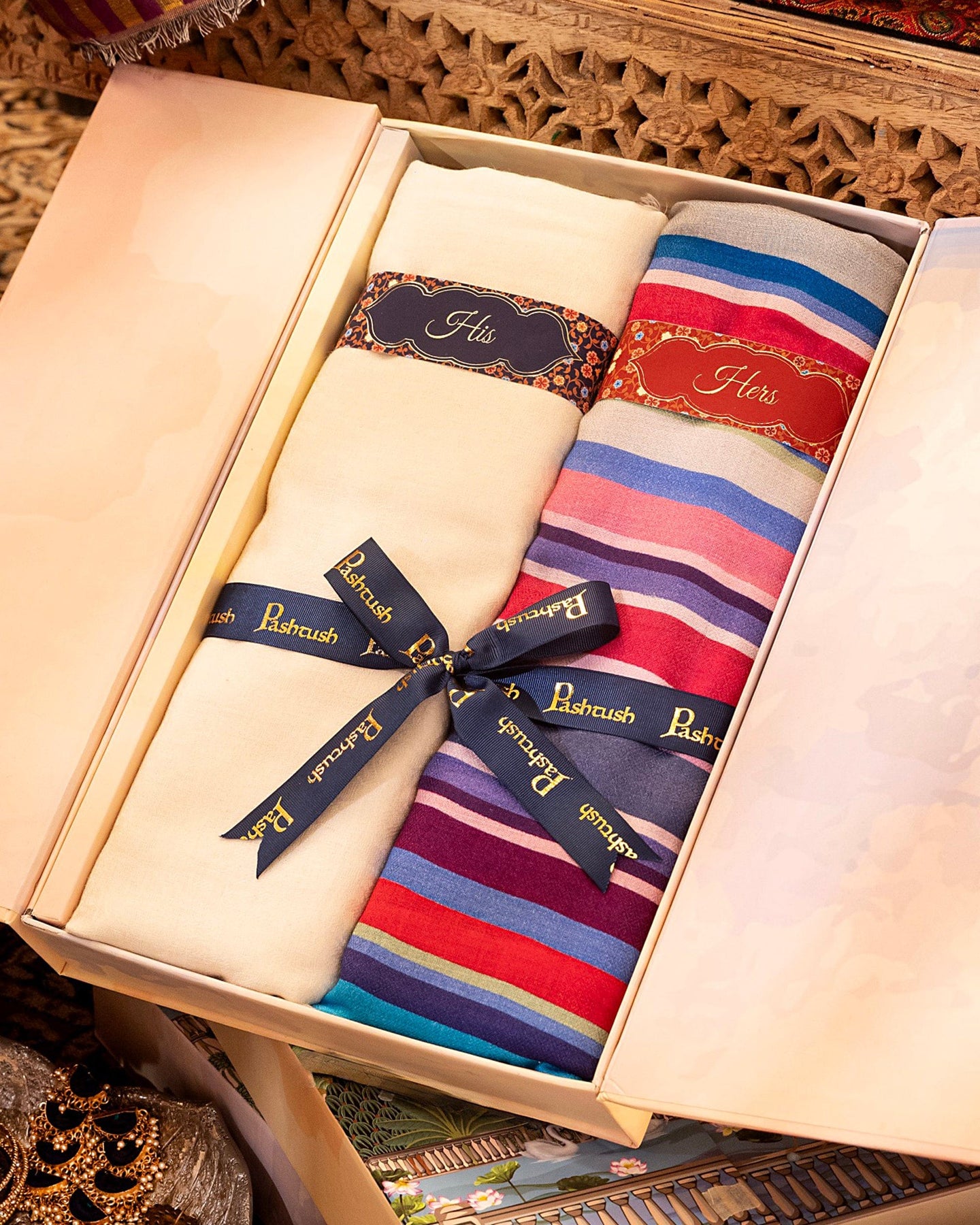 Pashtush His And Her Set Of Mens Fine Wool Muffler and Womens Bamboo Stole, Premium Gift Box Packaging, Ivory and Multicolor