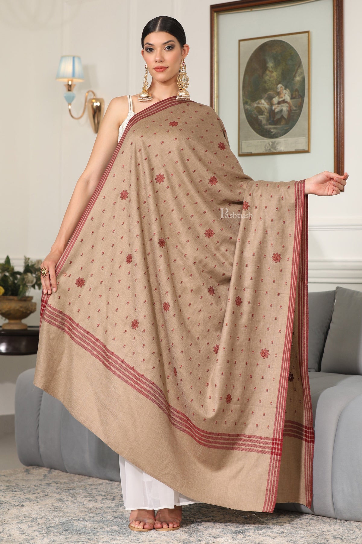 Pashtush Womens Fine Wool Shawl, Booti Embroidery Design, Beige