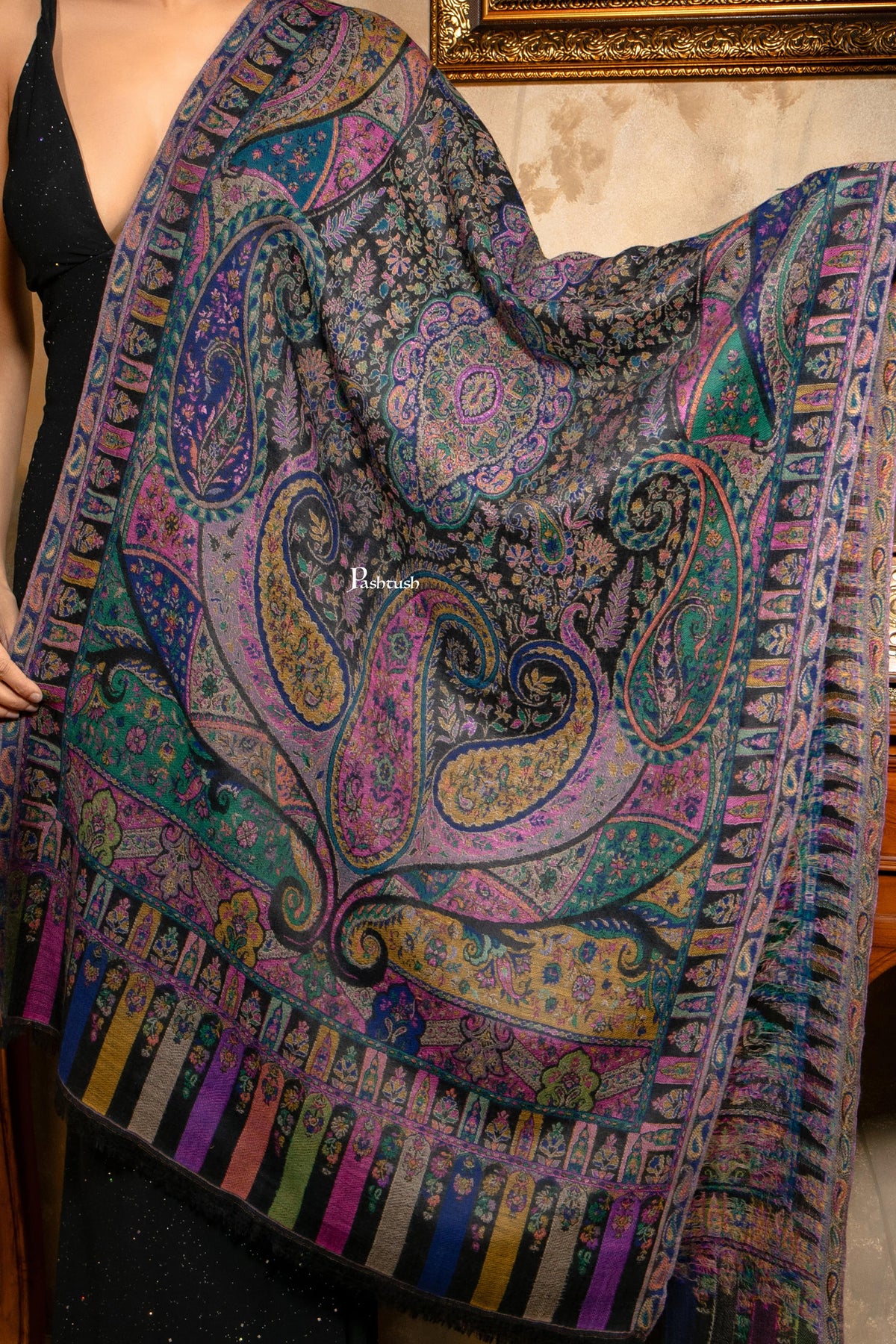 Pashtush Womens 100% Pure Wool With Woolmark Certificate Stole, Paisley Design, Black