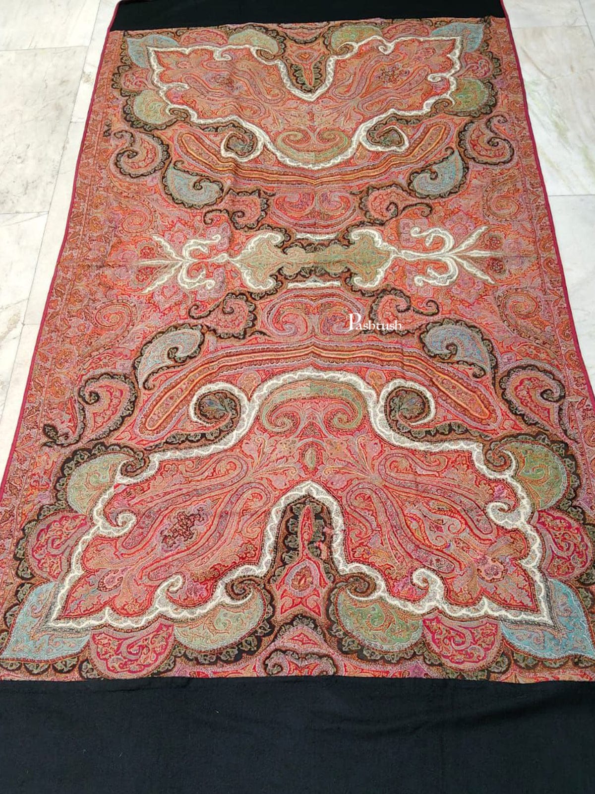 This exquisite Kani Pashmina shawl unfolds in a grand, mirror-image paisley composition that flows seamlessly across the entire canvas. The richly woven field is elegantly framed by deep solid black pashmina pallas at both ends, lending the piece a poised, architectural finish.
