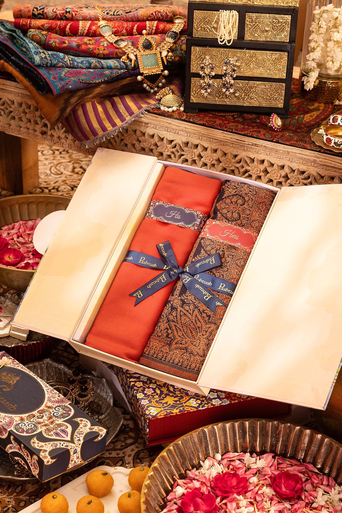 Pashtush His And Her Set Of Mens Extra Fine Wool Stole and Womens Faux Pashmina Shawl, Premium Gift Box Packaging, Orange and Navy Blue