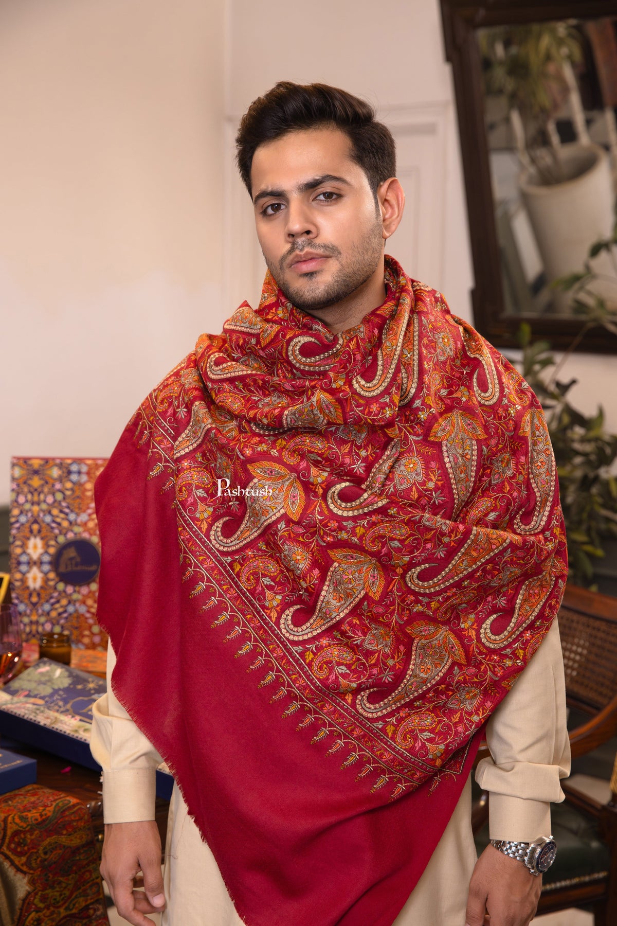 Pashtush Mens Extra Fine Wool Shawl, Paisley Design, Maroon