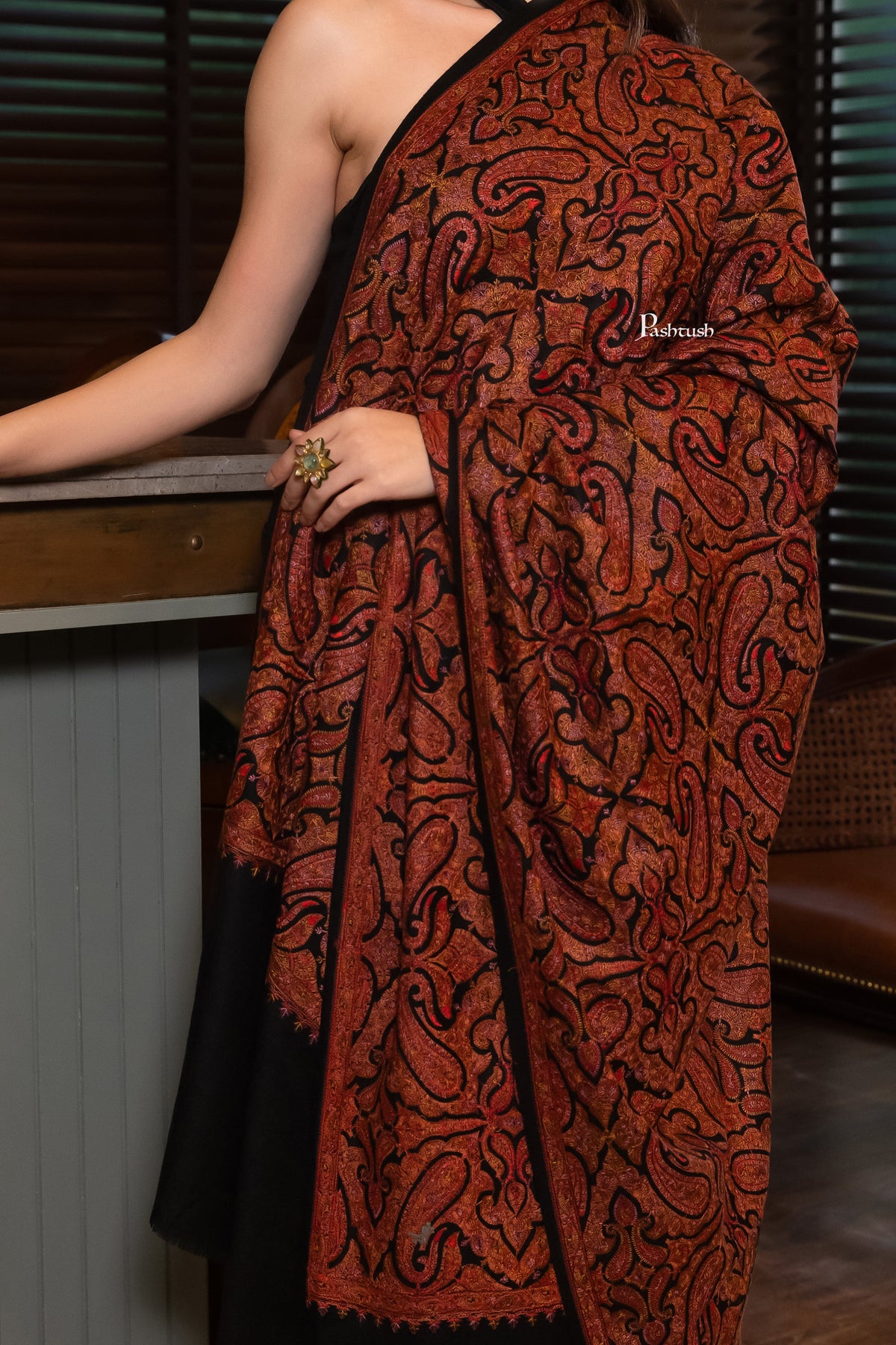Pashtush Womens Extra Fine Wool Shawl, Pasiley Embroidery Jama Design, Black