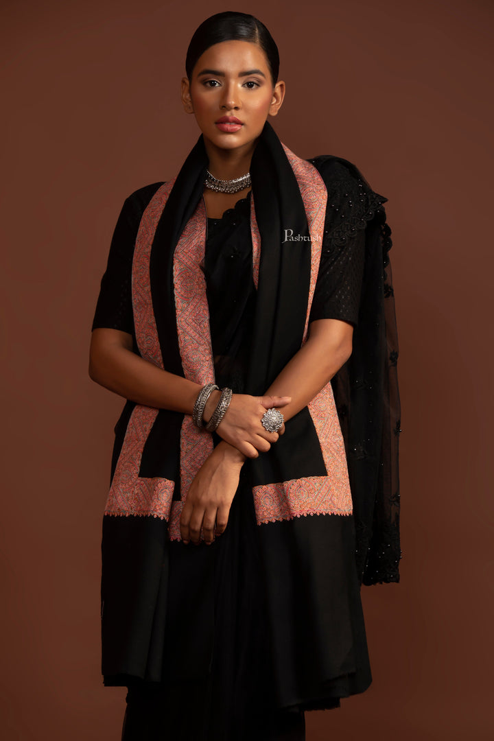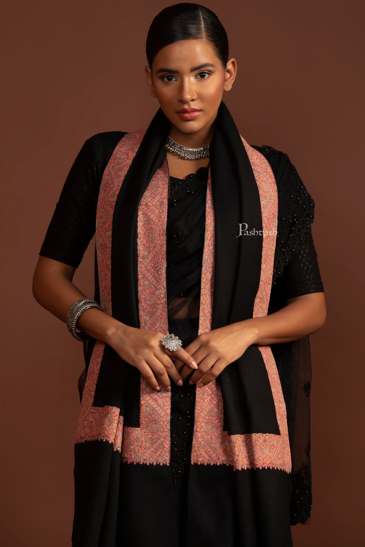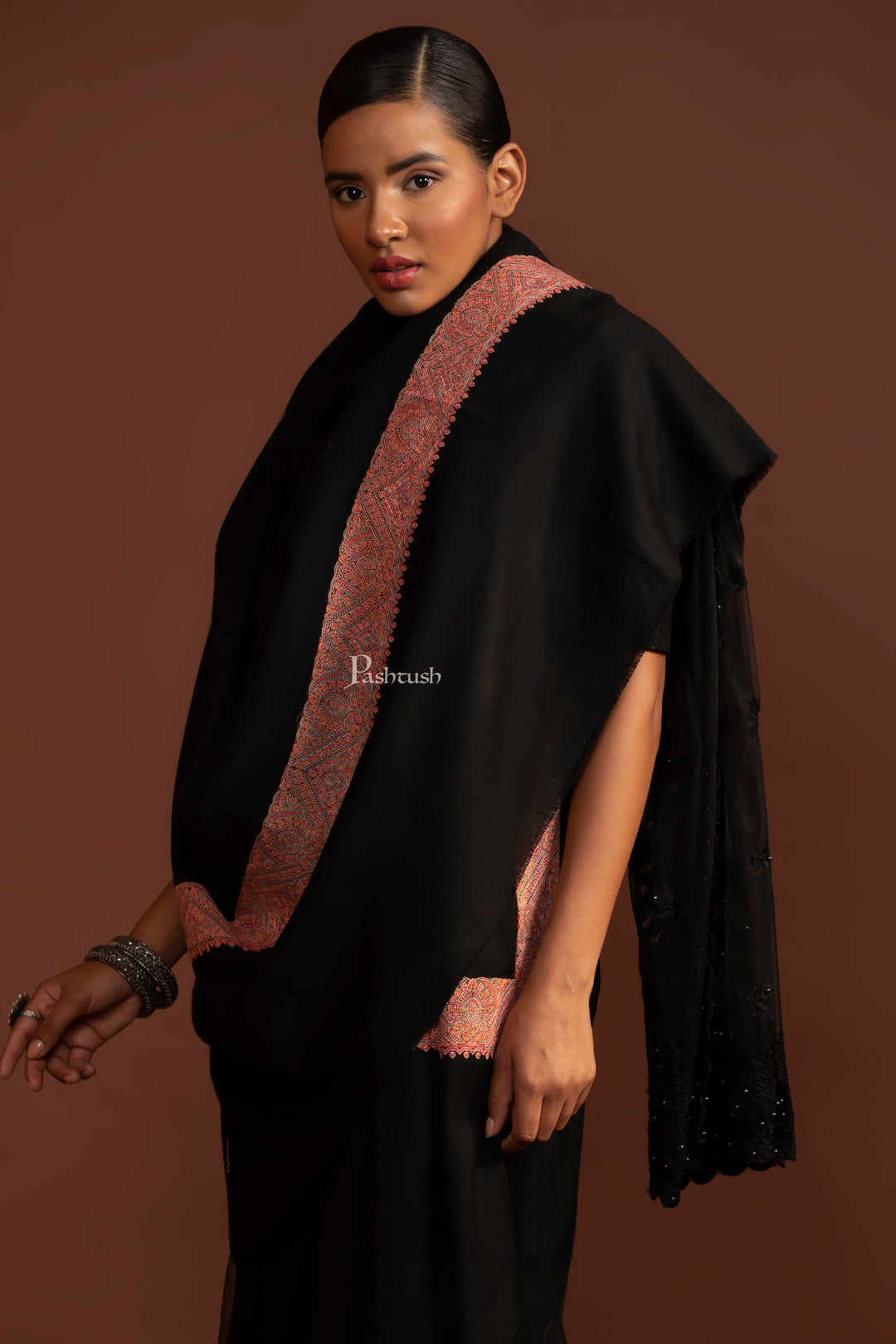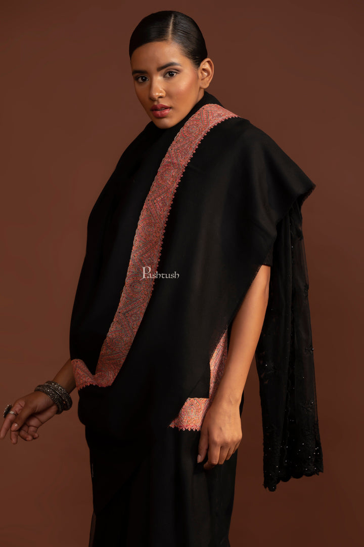 Pashtush Womens Fine Wool Shawl, Border Embroidery, Challa Daur, Black