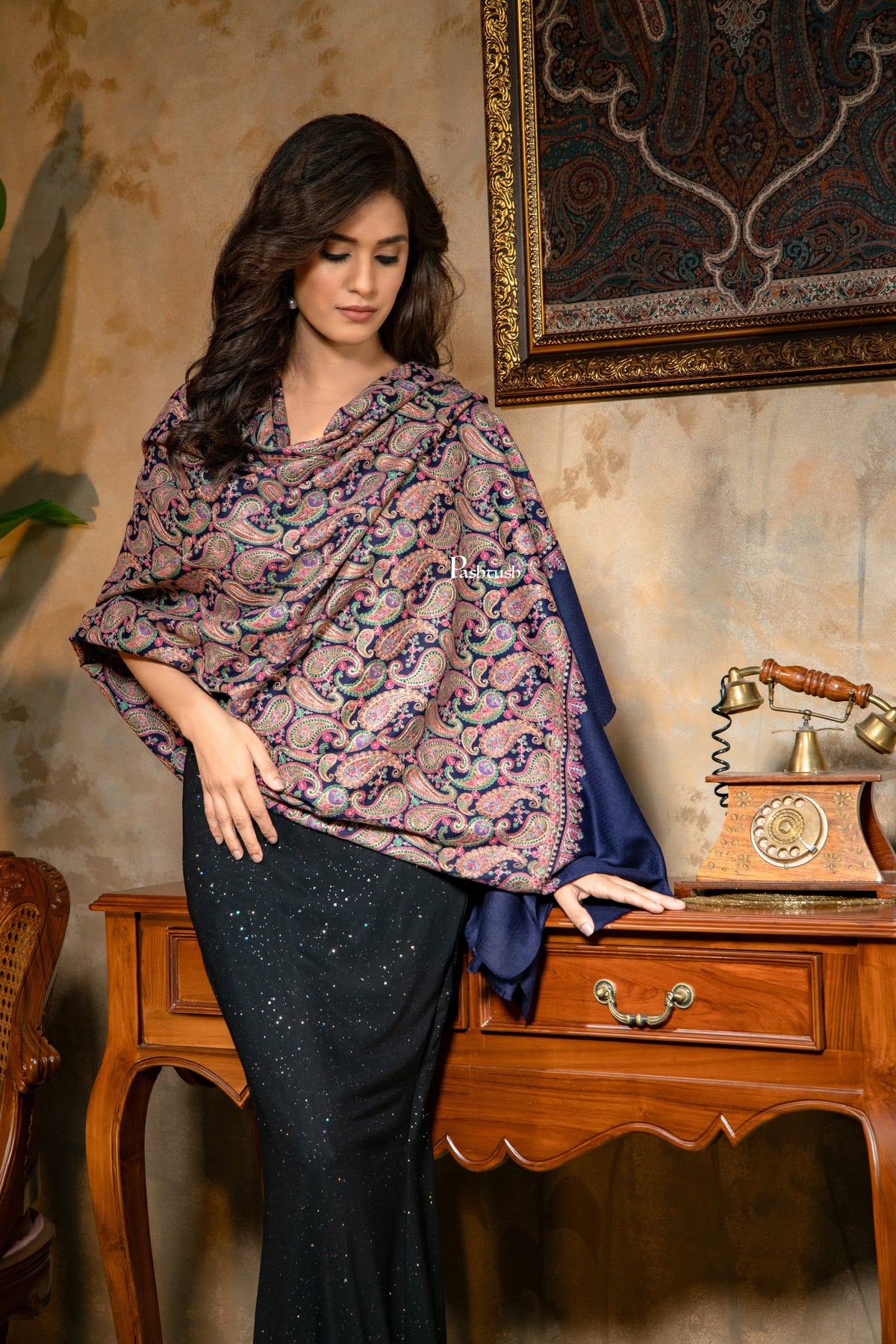 Pashtush Womens Fine Wool Shawl, Heavy Jaal Nalki Embroidery Design, Blue