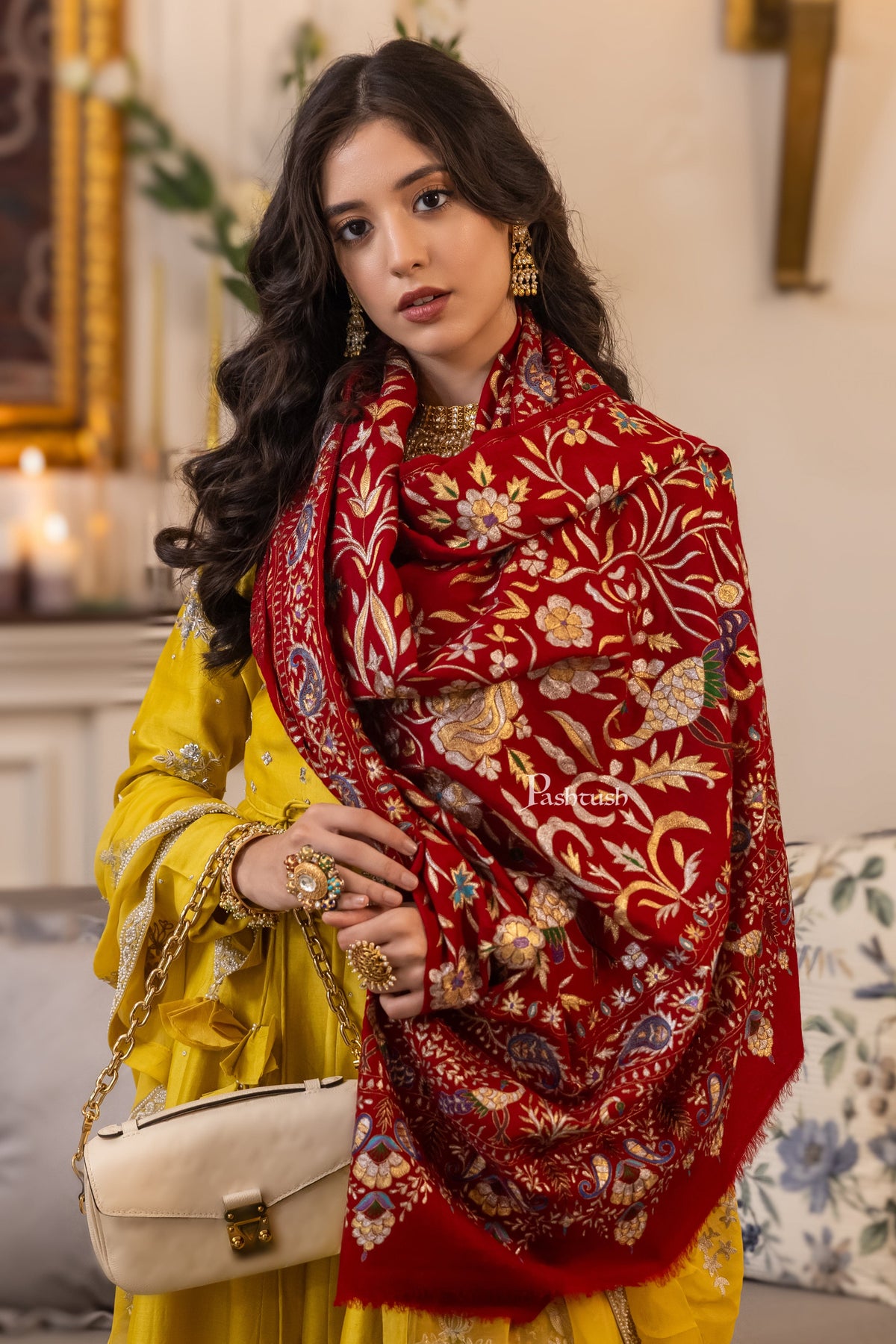 Pashtush Womens Pashmina Shawl, With Kashmiri Tilla Embroidery, Hand Woven, hand Embroidered