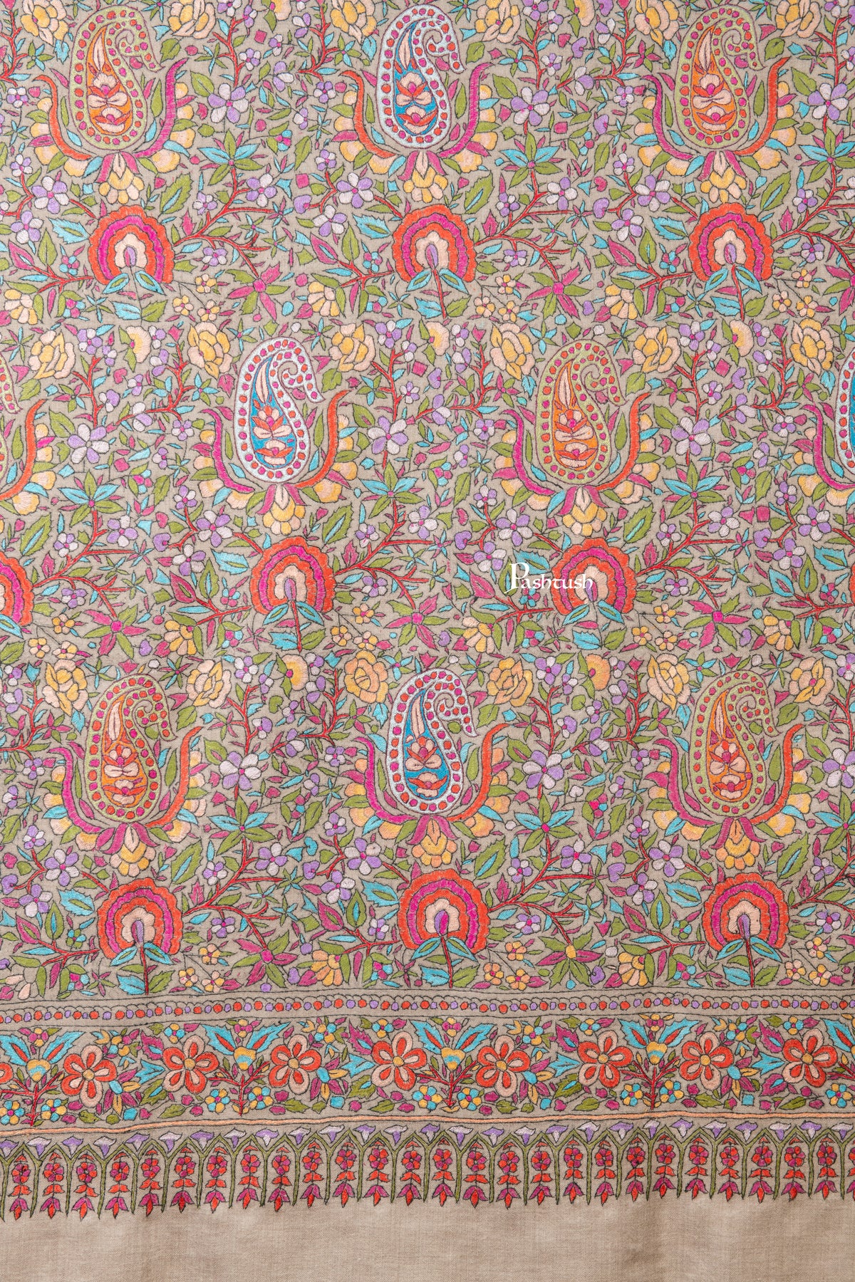 Pashtush Womens Pure Pashmina Shawl, Papier Mache Hand Embroidery, Hand Woven, Gulabdaar Design, Multicolour With Natural Woven Base
