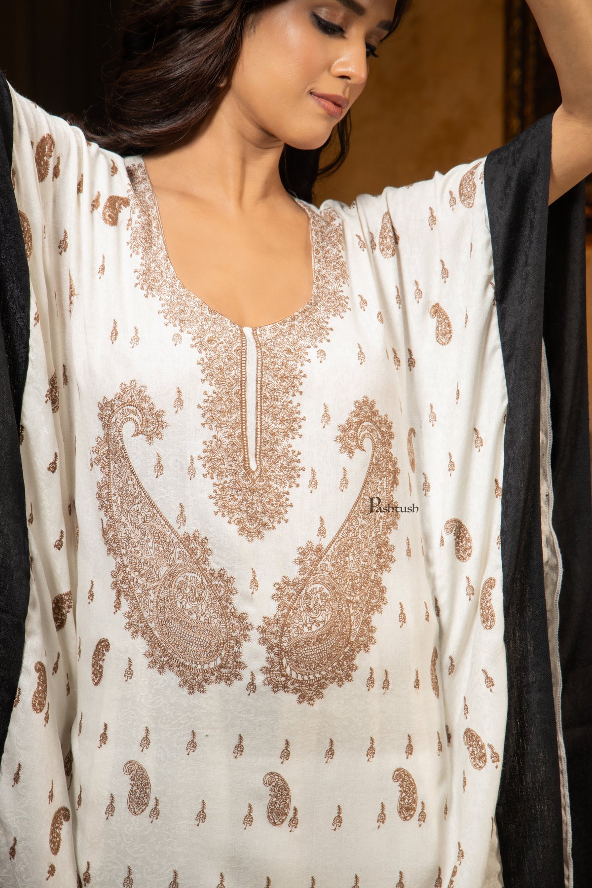 Crafted from luxuriously woven fabric, this Pashtush kaftan dress features an exquisite Jamawar design in regal taupe tones, interlaced with rich, heritage-inspired paisleys. The intricate woven craftsmanship reflects the age-old Kashmiri artistry that Pashtush celebrates. With its relaxed drape and fine finish, this piece offers effortless sophistication and timeless elegance for the discerning woman.