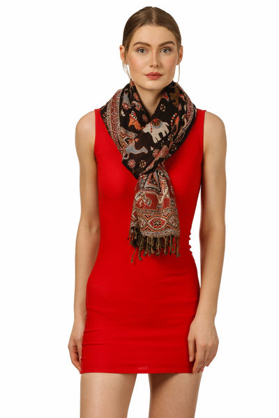 PASHTUSH WOMENS BAMBOO REVERSIBLE STOLE, TRIBAL ELEPHANTS